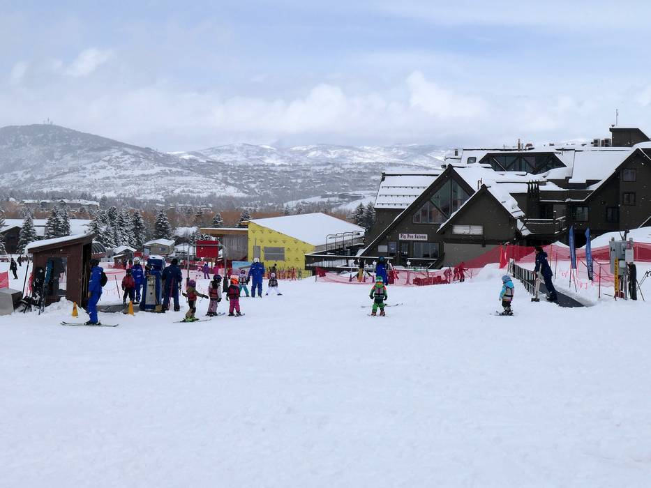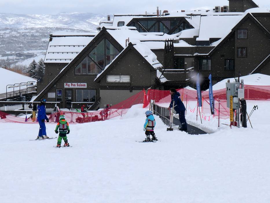 At the valley station in Park City Canyons Village, children can practice on the magic carpet in the ski school.
