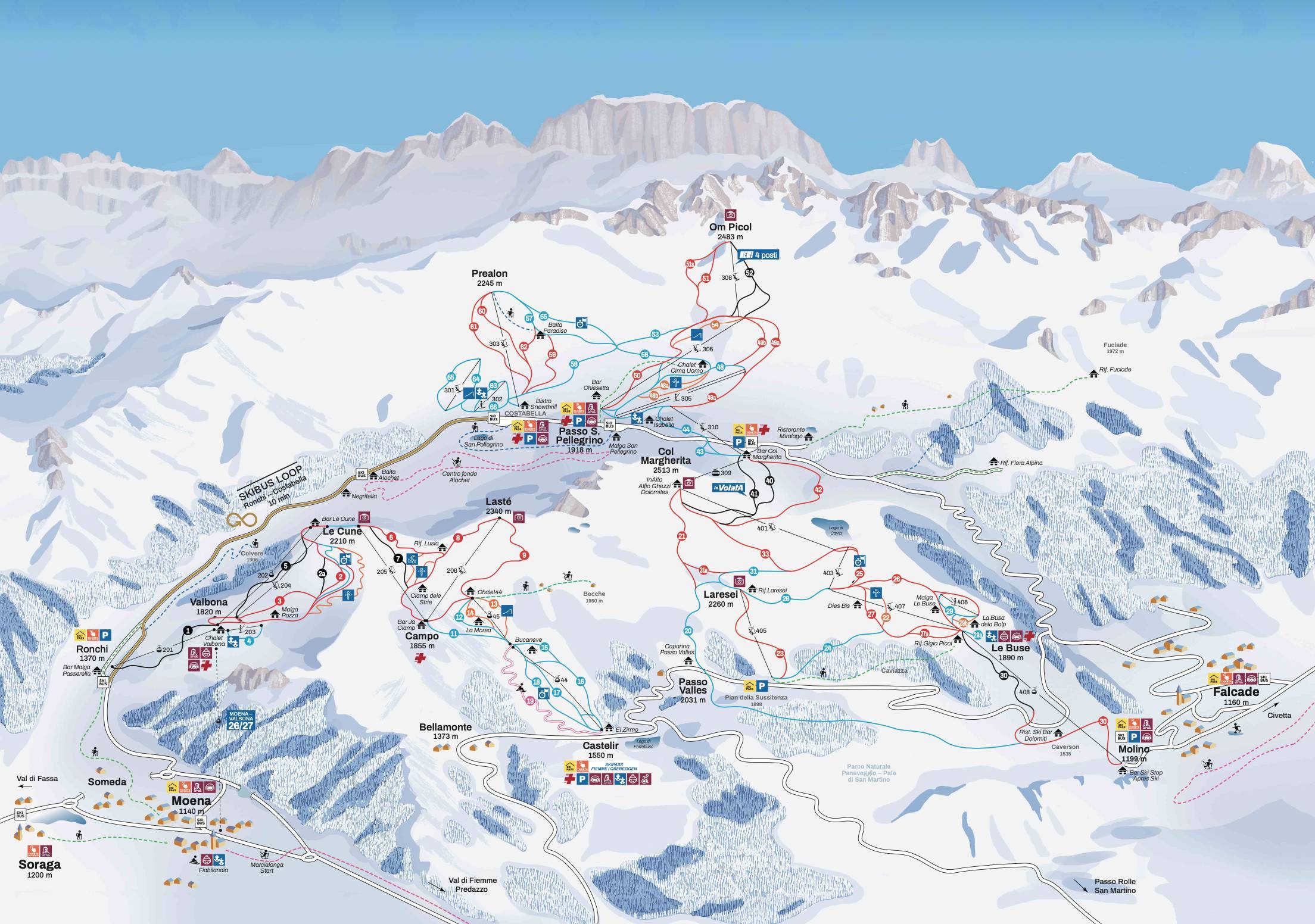 Large information boards provide guests with important information. The current operating status is usually also indicated. The two locations, Passo San Pellegrino and Falcade, are always well signposted. The signage and slope markings are clear.