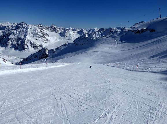 There are slopes of all difficulty levels on the Pitztal Glacier, the highest ski area in Austria. Both experts and beginners will find their perfect terrain. All slopes on the Pitztal Glacier are wide and excellently groomed. The intermediate slopes predominate, but they are usually very wide and not too steep, so that beginners can also ski on them. With good snow conditions, you can ski with a guide via the Taschachtal variant all the way down to the valley station of the Gletscherexpress in Mittelberg.