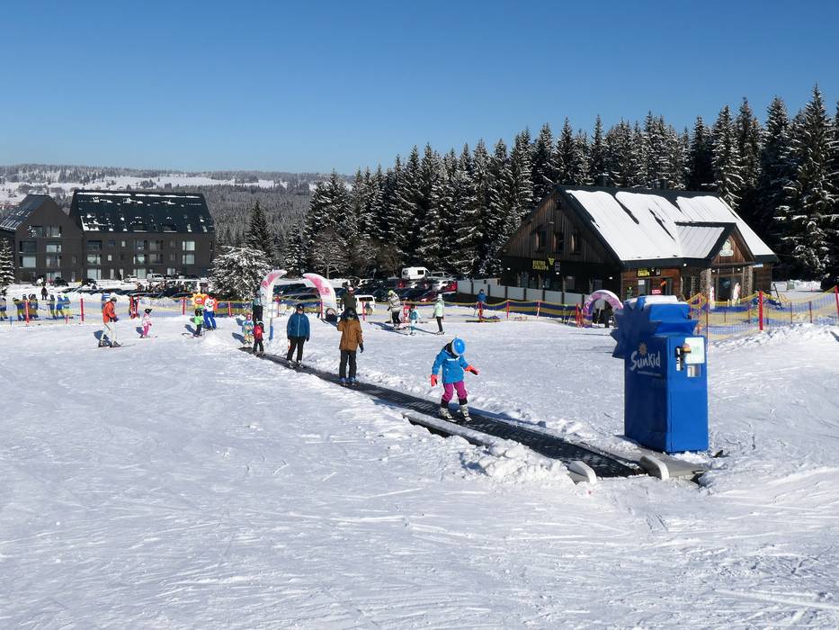 Chairlifts from three sides lead up to Pleßberg (Plešivec), the prominent ski mountain (1,028 m) in the Czech Ore Mountains. Two chairlifts are fast, one is fixed-grip. The drag lift at Abertamy has been decommissioned. Several conveyor belts for practice (magic carpets) are located in the children's area.