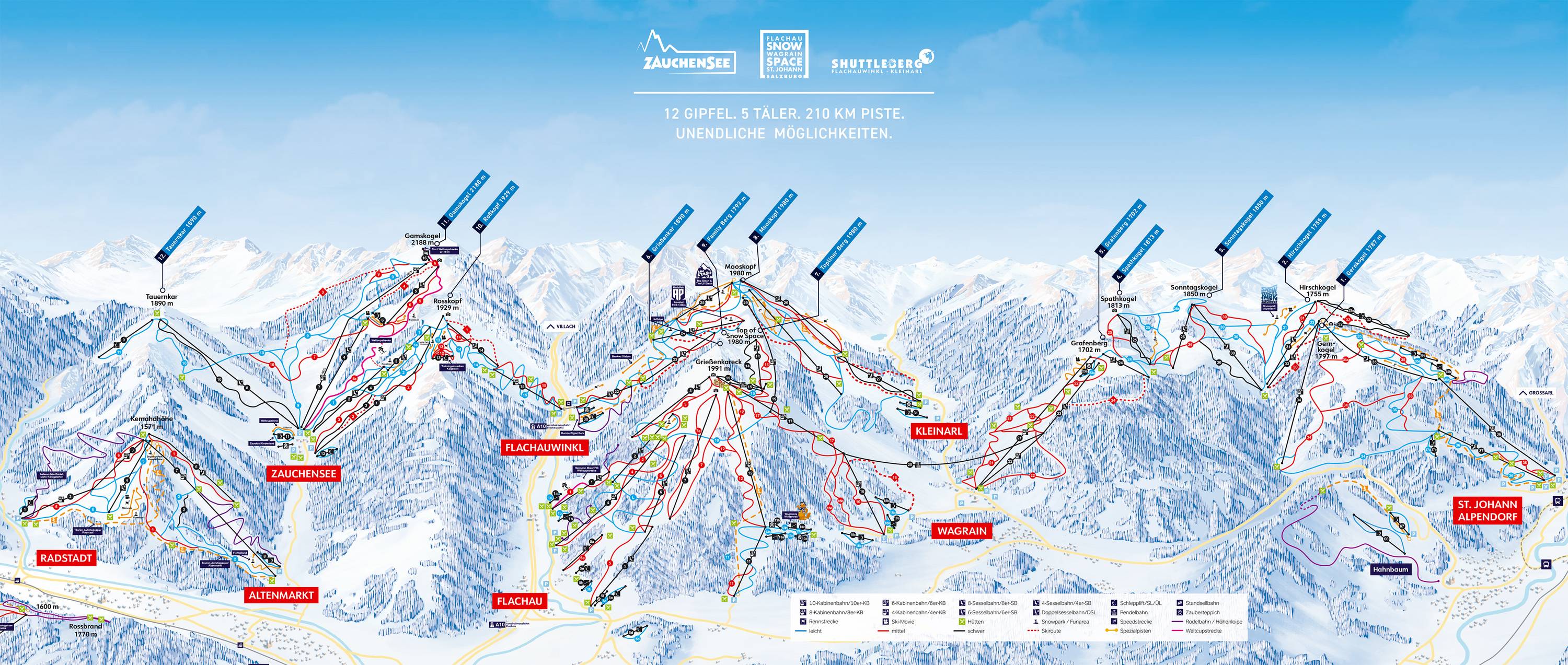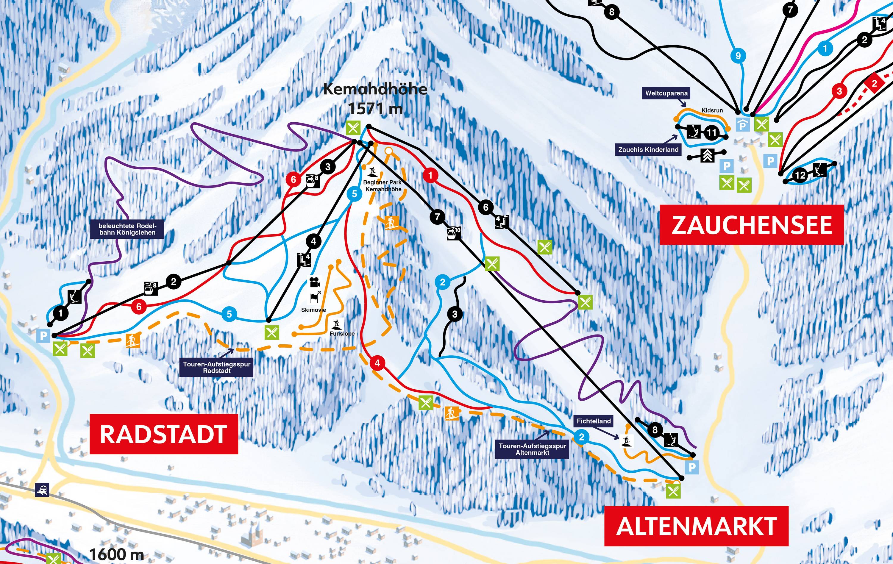 The slope map provides a good overview of the ski area. All lifts and huts are marked and described with additional information. All slopes are shown, but not described in detail. On the reverse side, you will find the slope map of Zauchensee. The ski area is also integrated into the slope maps of Ski amadé.