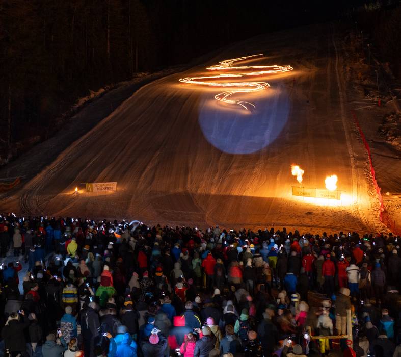 Ramsau am Dachstein welcomes its guests with an atmospheric welcome snow festival. 60 to 100 performers, mostly ski instructors from the Ramsau ski schools, put on a fantastic show and enchant guests with acrobatic performances on the Rittisberg Nordhang.