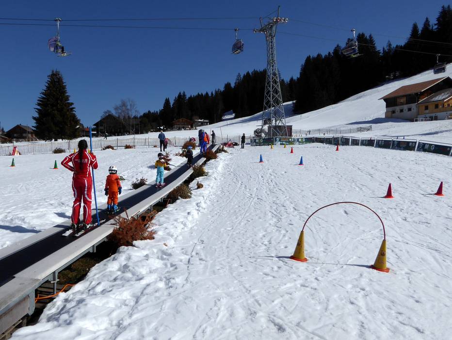 The children's area is located on the outskirts of Schönried. Operated by the Skischule Schönried, it lies directly below the Horneggli chairlift. Two children's rope tows and a conveyor belt with fun figures invite little ones to make their first turns in the snow. There is also a children's carousel.