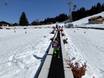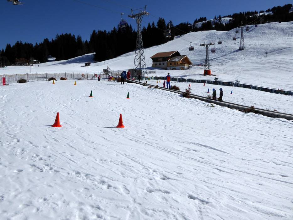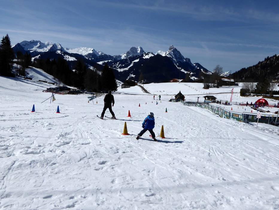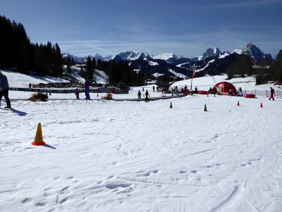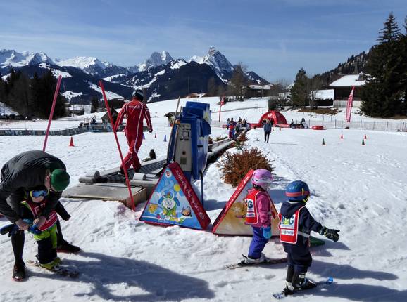 The practice area in Saanenmöser is operated by the Schneesportschule Saanenmöser and is located right next to the valley station of the Lätz Güetli drag lift. A conveyor belt quickly and safely brings the little ones up the slope. Fun figures complete the offer.