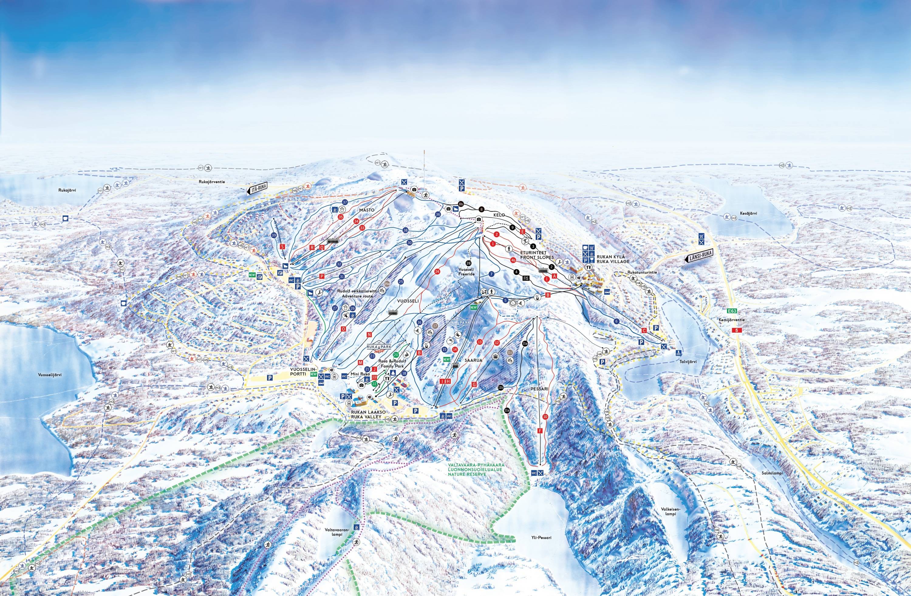 The slope map provides a good overview of the entire Ruka ski area. The lifts are listed with all relevant information. The runs show the piste numbers, but not the names. Elevation details would be a welcome addition. Dining options are marked with symbols. There is also information about the children's slopes and a map of Ruka Village.