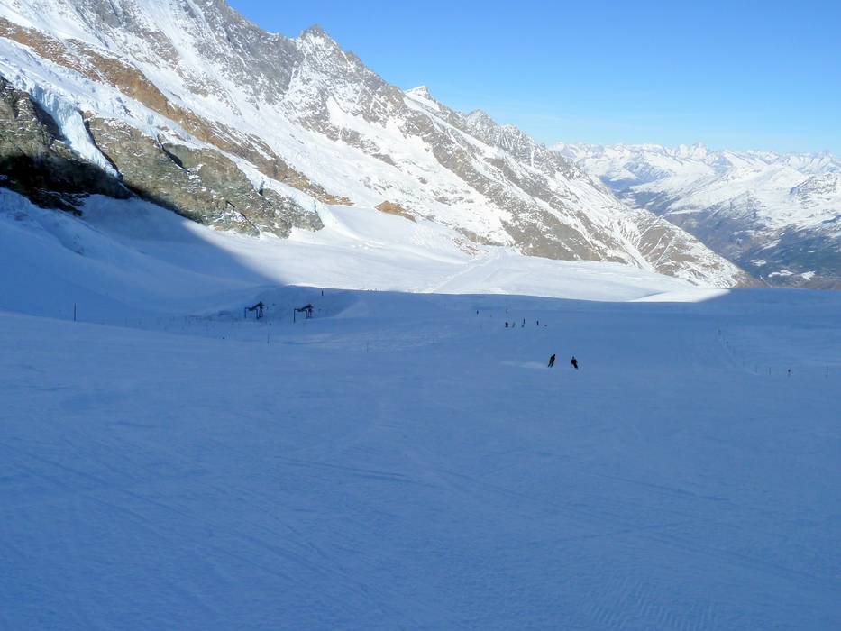 The Saas-Fee ski area offers slopes of all difficulty levels. Most of the runs are located above the tree line and are generally very wide. The glacier runs on the Feegletscher are quite steep at the top and become progressively flatter further down. Around the Morenia station, you will find many intermediate slopes served by the six-seater chairlift. The slopes from Längfluh via Spielboden down to Saas-Fee are particularly impressive. Here, you ski past massive glaciers and continue through very rocky terrain. At Plattjen, you will find quite challenging slopes. The runs in the lower section lead through forest clearings down to Saas-Fee. In the valley area, there are easy and wide beginner slopes.