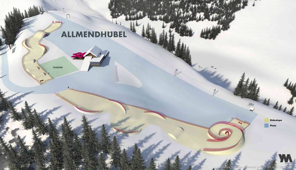 A permanent ski cross run is taking shape directly below the Winteregg chairlift. Waves, banked turns and jumps beckon with slopeside thrills for skiers of all ages.Kidsslope - Allmendhubel