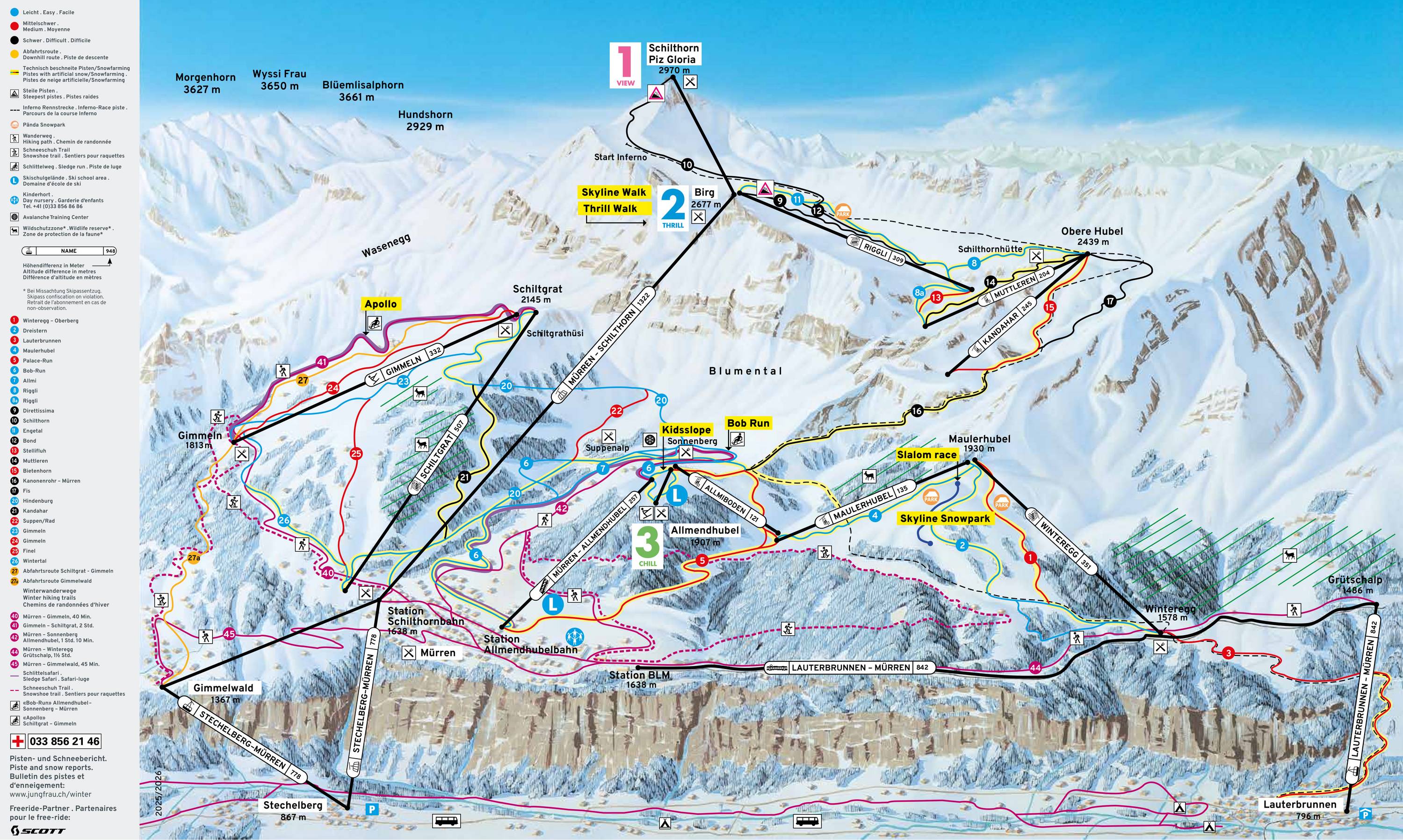 Mürren (0.3 km), Lauterbrunnen (0.8 km), Gimmelwald (0.3 km), Stechelberg Towns/villages at the ski resort