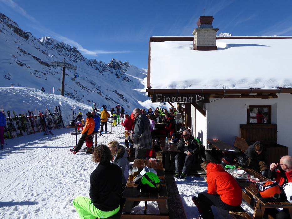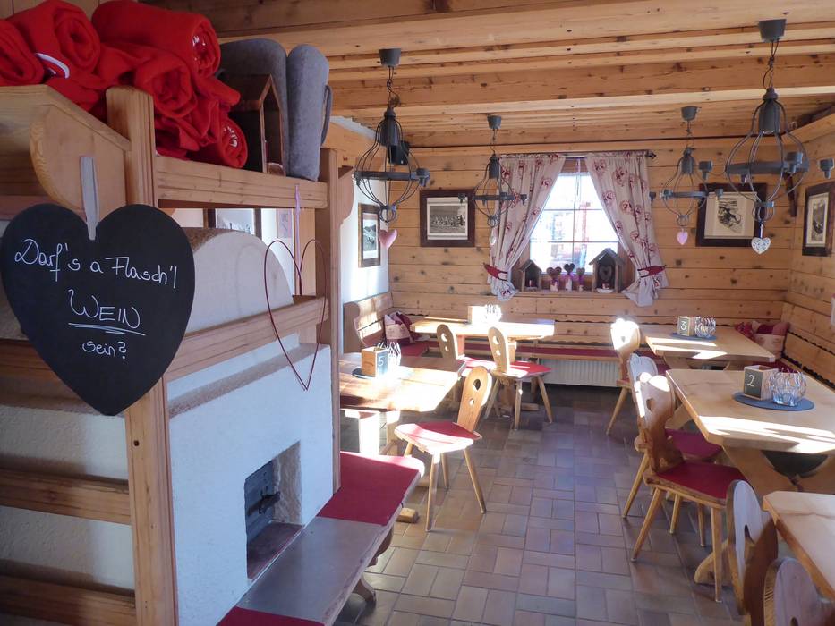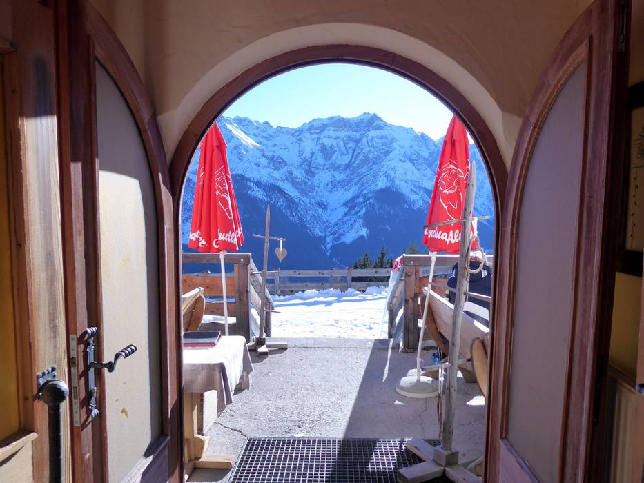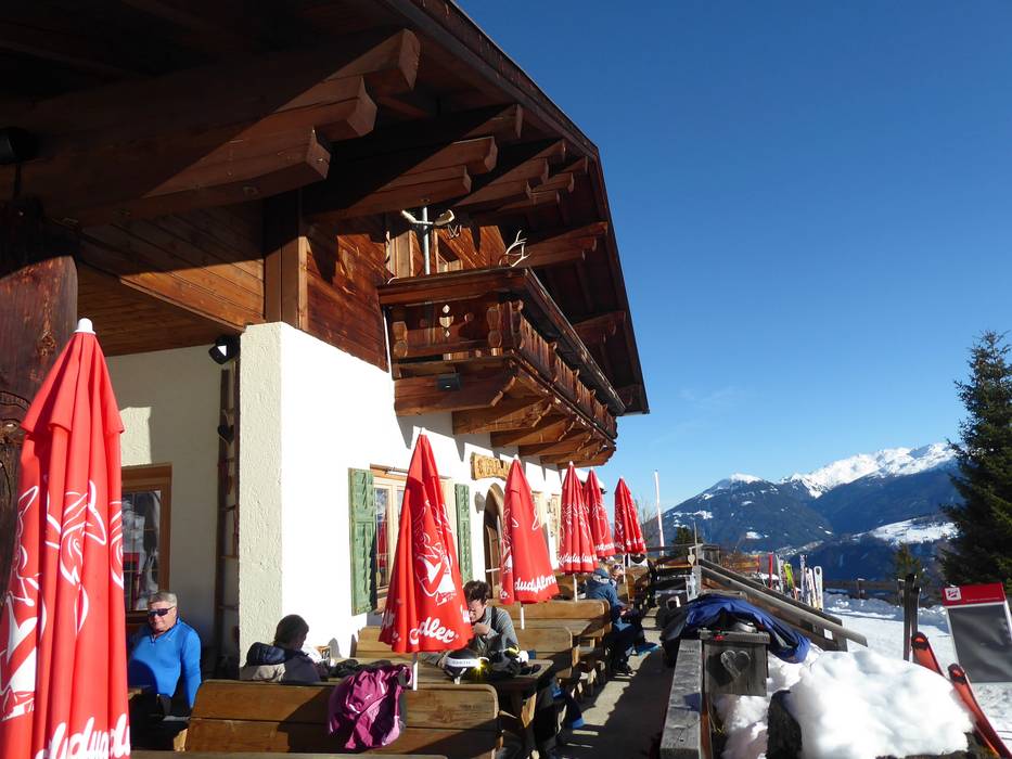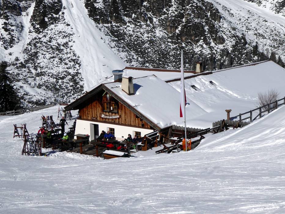 The Zirmachalm, part of Andreas Stern's hut empire, does without self-service, greatly increasing the coziness. It’s already quite inviting, with a magnificent tiled stove inside and a sun terrace outside offering the best views of the slopes. Hearty Tyrolean inn cuisine completes the experience, making it a popular spot for a break.