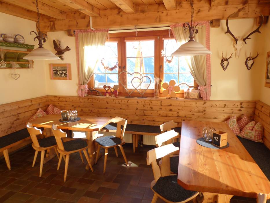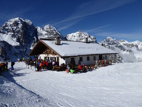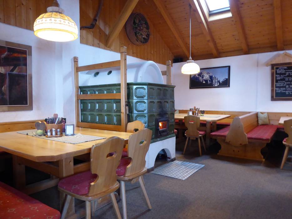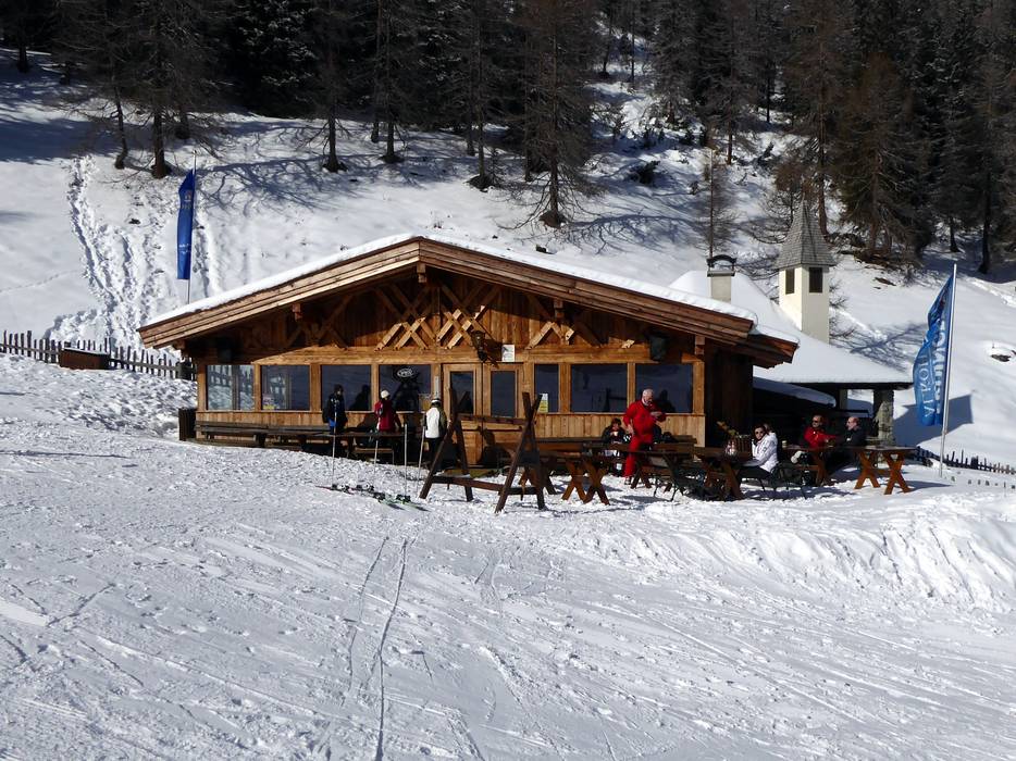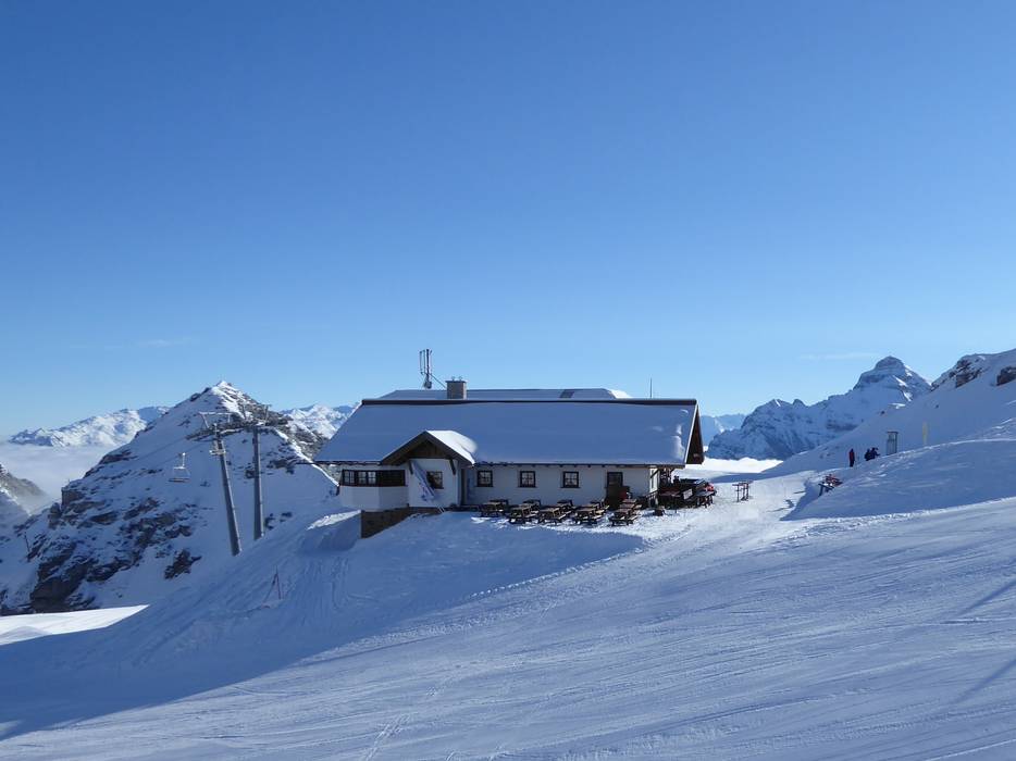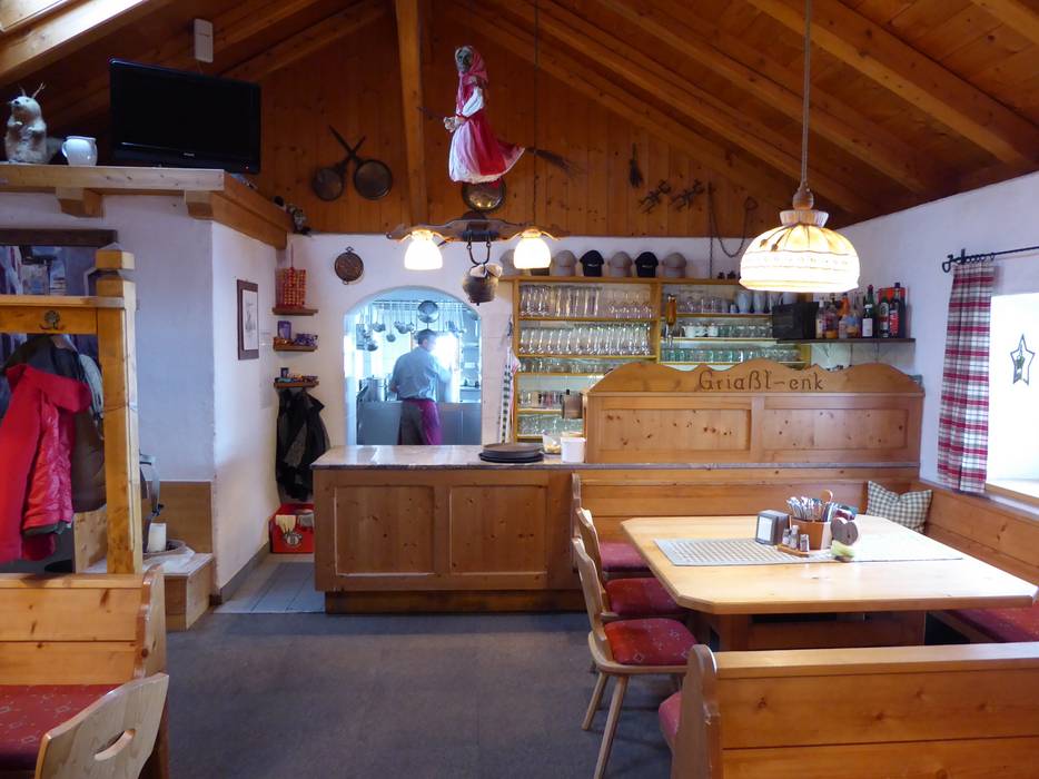 The Zirmachalm, part of Andreas Stern's hut empire, does without self-service, greatly increasing the coziness. It’s already quite inviting, with a magnificent tiled stove inside and a sun terrace outside offering the best views of the slopes. Hearty Tyrolean inn cuisine completes the experience, making it a popular spot for a break.