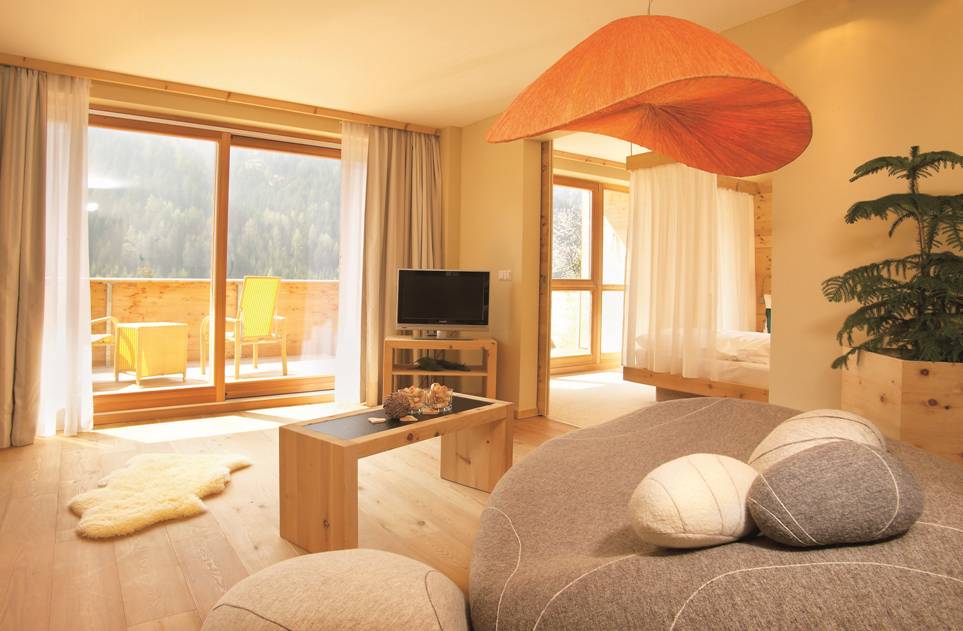 The Arosea Life Balance Hotel is located in the beautiful Ultental valley in Kuppelwies by the lake. It’s just a 2-minute drive to the Schwemmalmbahn valley station. However, the complimentary hotel shuttle is happy to take guests the short distance to the valley station. The hotel features extensive woodwork, and even the entire facade is made of wood. All good things take time, and in a few years, the Arosea will acquire the wonderful dark hue of the traditional Ultental farmhouses.