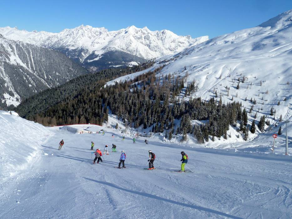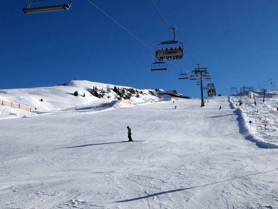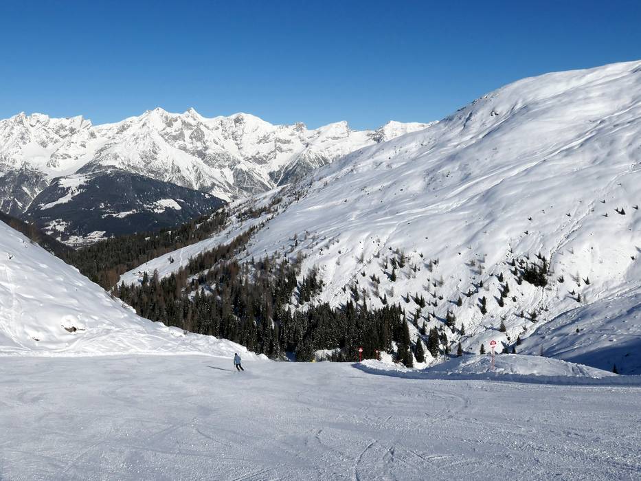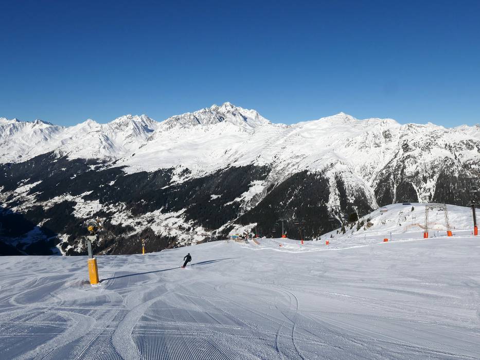 A fully snow-covered valley run leads all the way to the valley station in See.