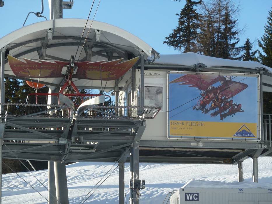 The "Fisser Flieger" is a flying machine similar to a double-decker plane that carries four passengers and lets them soar from 8 to 47 metres high. The "Flieger" enables this soaring using reels upon which a stable steel cable glides and can not come loose. The passengers hang in a hang-gliding harness that gives the feeling of a free flight, yet offers optimum safety. This ride begins at the Moeseralm base station.2005/2006