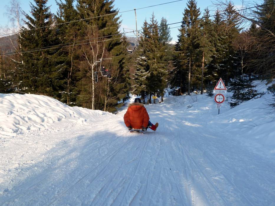 The 600m long winter toboggan run starts at the mid-station of the chairlift. Gentle, supportive snowmaking ensures reliable snow conditions. Toboggans can be rented at the valley station, and the chairlift takes you up the mountain. You can take a break at the Bergmann-Schänke and enjoy the magnificent view. Fun for the whole family.