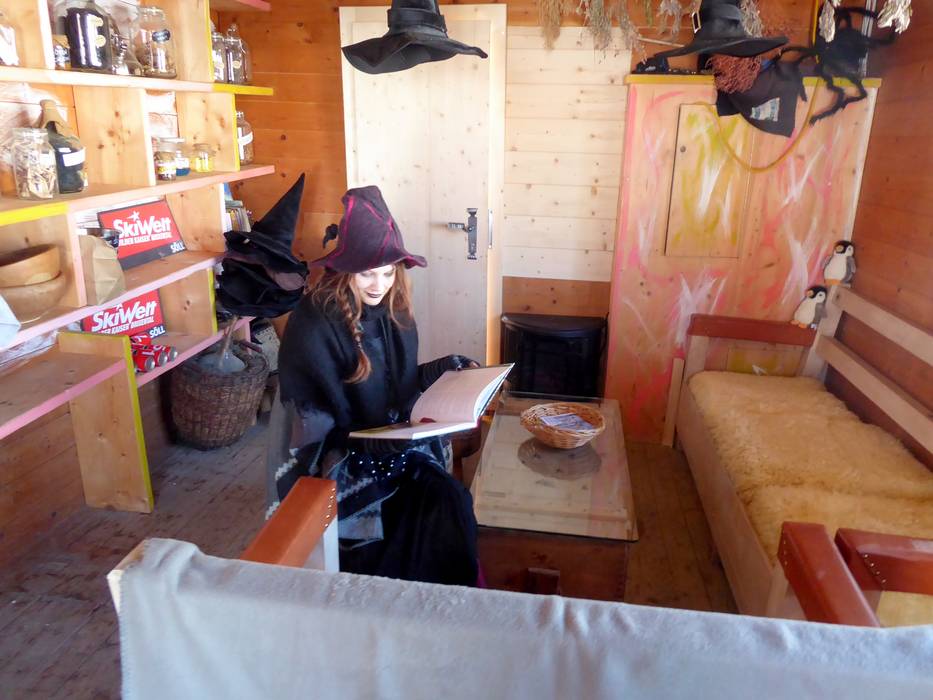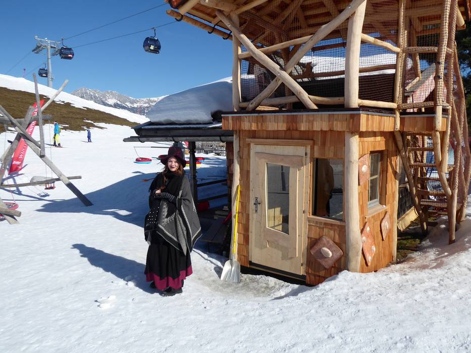 The enchanted children's area is located directly below the mountain station in Hochsöll. It is freely accessible and offers a small fun conveyor belt, a winter playground, and a natural ice skating rink. Every day, the witch tells stories in the gingerbread house. In the afternoon, there is a campfire with popcorn. Fun for the whole family. Parents can relax in the deck chairs and enjoy the sun.
