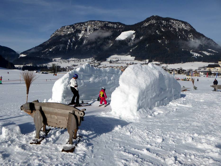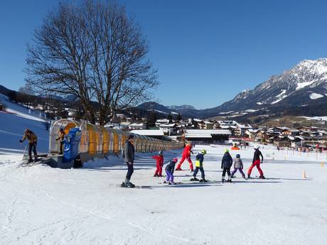 On more than 7,000 m² of secured terrain at Brandstadl, a variety of activities are offered to make learning to ski an adventure for children. An extra-wide conveyor belt ensures optimal learning success, along with "Helping Hands" from the instructors. The Kinderskischule Scheffau am Wilden Kaiser operates the Kinderland.