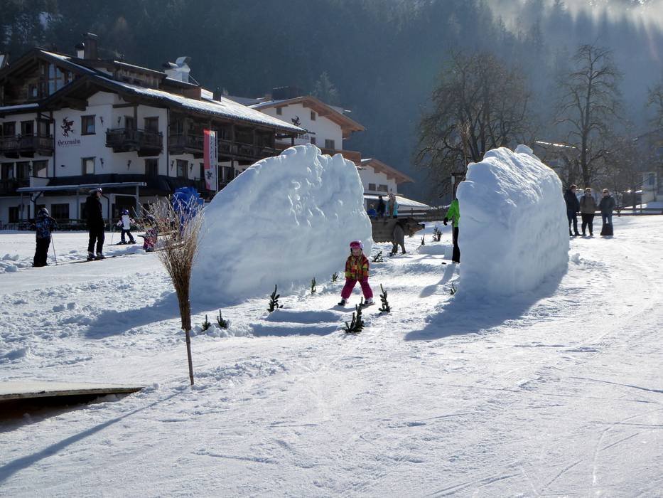 In the SkiWelt Wilder Kaiser-Brixental, there are 4 completely free practice areas in the valley. This free offer is ideal for families: SkiWelt Itter (Salvista practice lift & Mitterwieslift), SkiWelt Söll (Hexenwiese), SkiWelt Westendorf (practice area), and SkiWelt Hopfgarten (practice area). In all locations of SkiWelt Wilder Kaiser-Brixental, there are also large children's areas run by ski schools, featuring magic carpets and practice lifts. The children's areas are located either in the valley or at the mountain stations of the gondola lifts. In addition, there are several childcare facilities available for children from 5 months of age. Several child-safe chairlifts transport the little ones safely back up the mountain. The ride on the 10-seater gondola Hans im Glück in Hochsöll becomes a fairytale experience. Every second gondola is decorated on the outside with a picture from "Hans im Glück." The route to the valley station of the gondola leads through the Hans im Glück ski course. Snow-covered and illuminated toboggan runs in Ellmau and Söll are also a delight for families. There are also many adventure slopes and attractive ski pass offers for families. The highlights in Söll include: Rabenrallye, Hexentrank, Zeitreise, verhexter Kindergeburtstag, HexenWinterprogramm, and the Winternacht in the Hexerei.