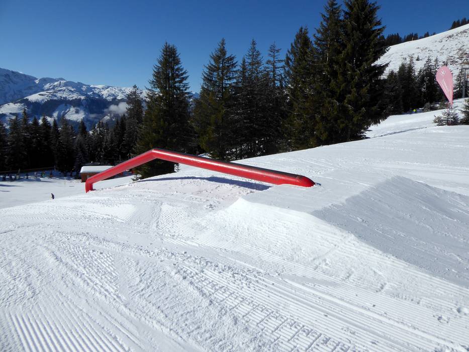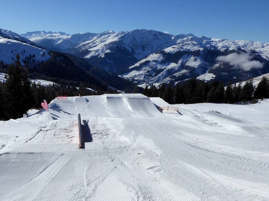 The Kaiserpark is located at the Tanzbodenbahn and, in addition to kickers, jumps, and rails, offers a magnificent view of the Wilder Kaiser.