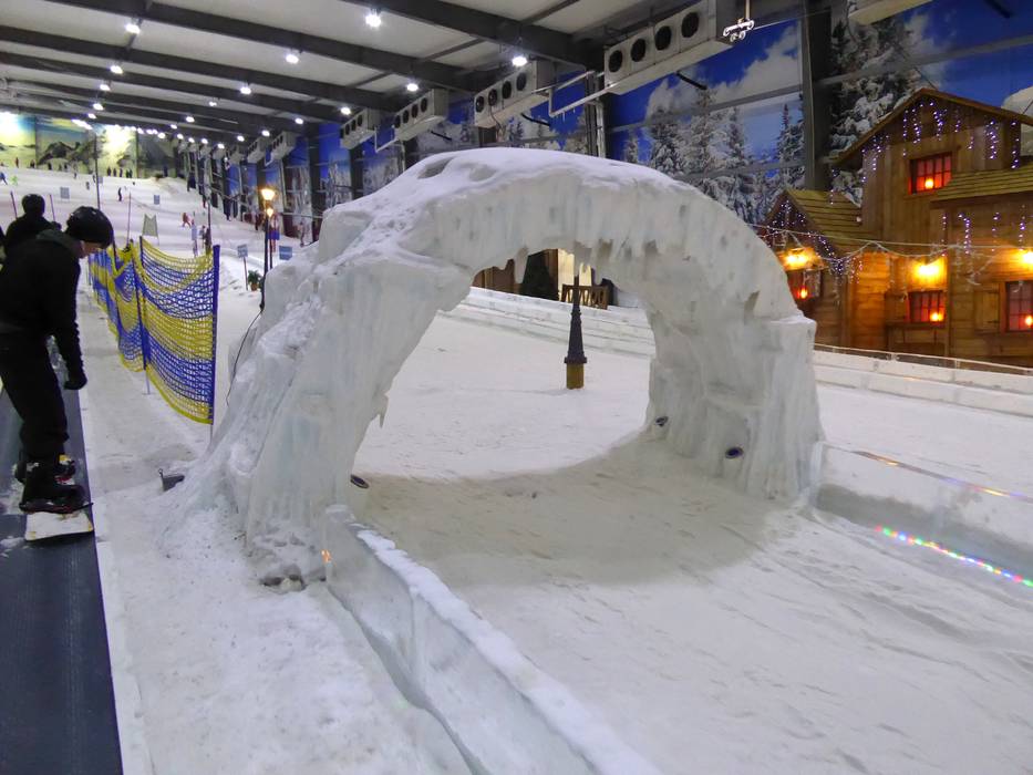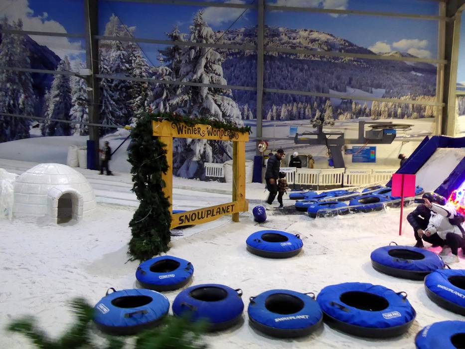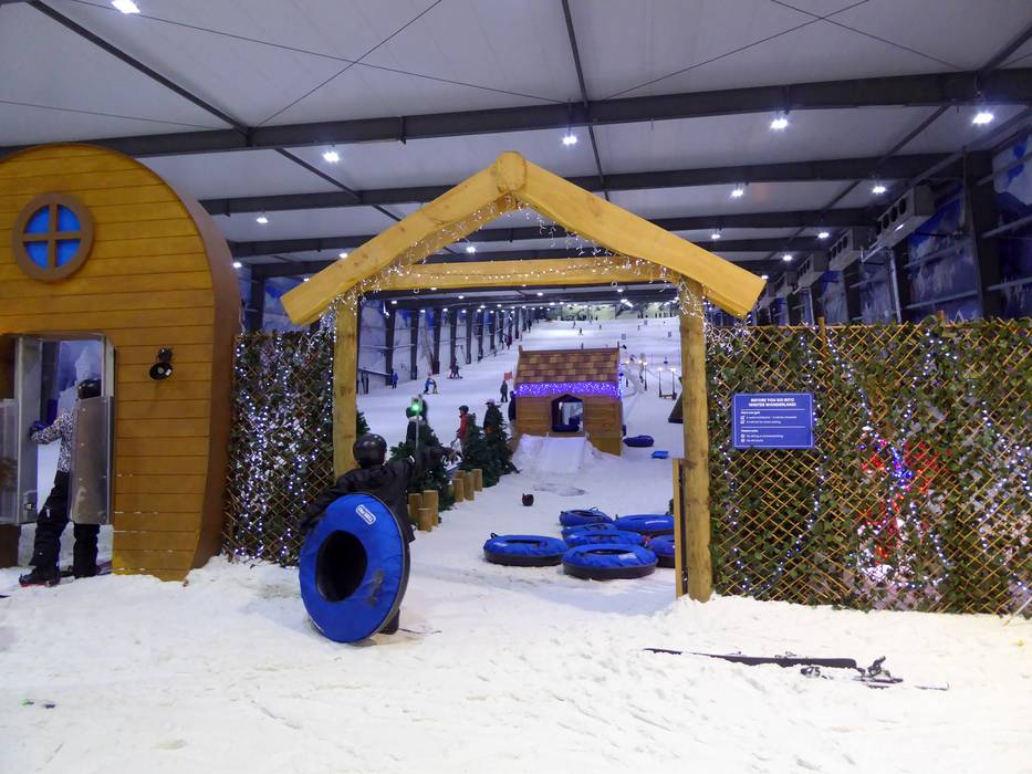The Winter Wonderland is a family-friendly Alpine village with snow-covered trees and activities such as a toboggan run and snow tubing. It is fun for the whole family and is located in the lower area of the ski hall.