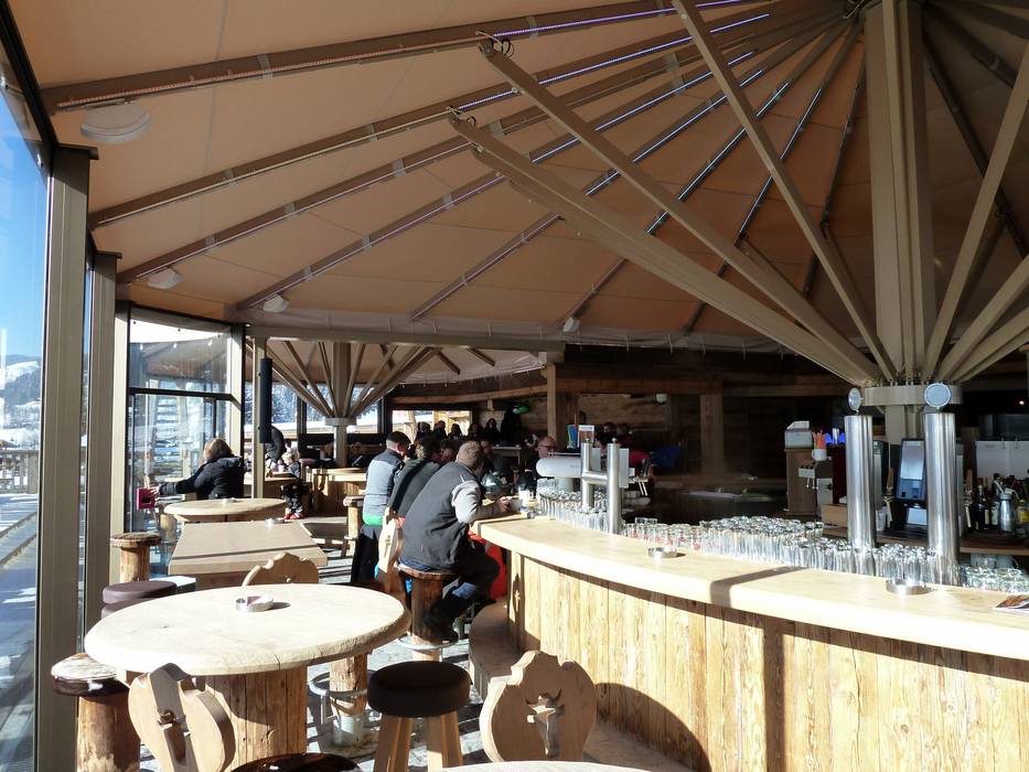 Large après-ski temple with umbrella bar and rustic party hut.