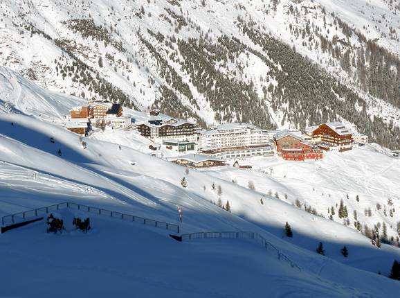 From the accommodations in Sölden (1377 m), the ski slopes are usually within walking distance, and there are also some accommodations with direct access to the slopes. The hotels in Hochsölden (2090 m) are located right in the middle of the ski area. There are no overnight accommodations on the glacier.