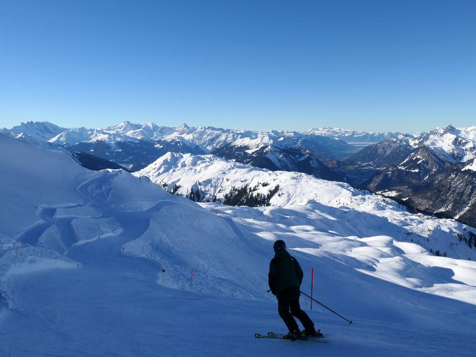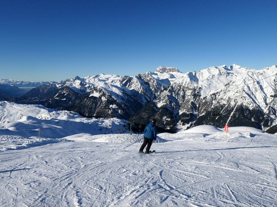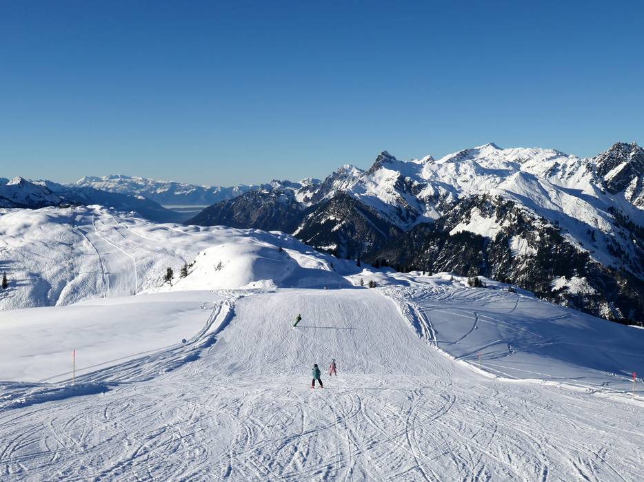 Magnificent panorama over the ski area down to the Walgau valley - Untermuri downhill run