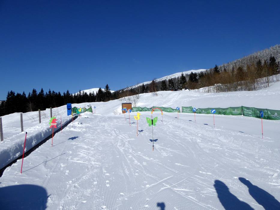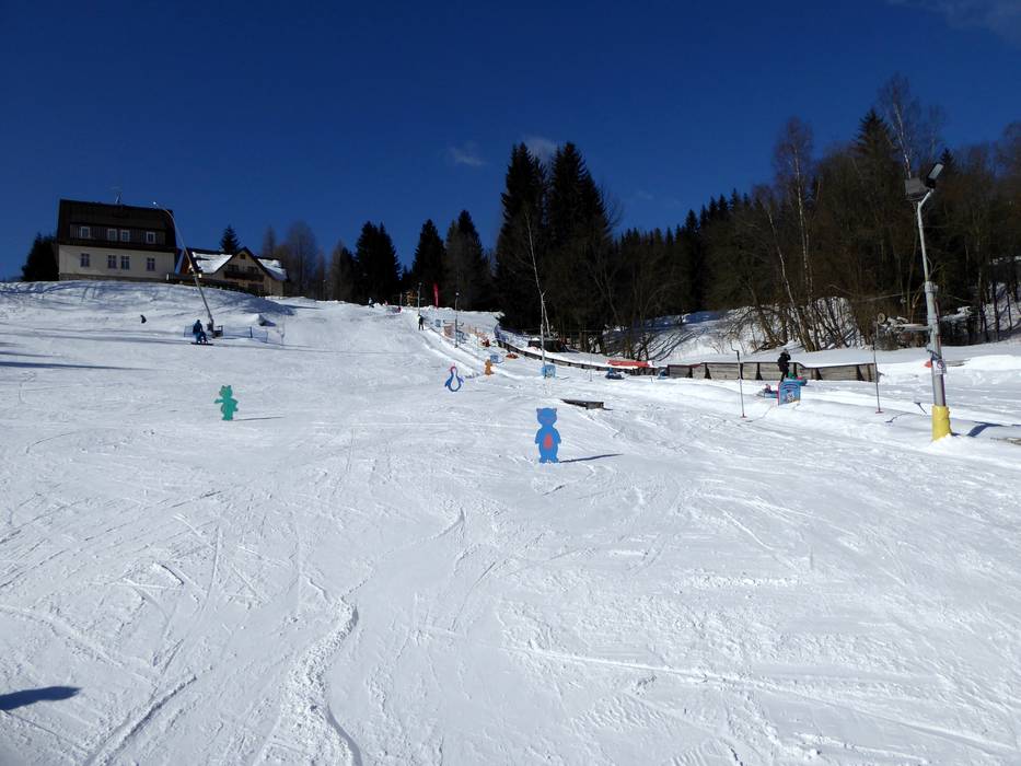 On the other side of the street from the Hromovka valley station, the beautiful ski park is somewhat hidden in the forest. At a conveyor belt, little ones can calmly practice slalom and enjoy wonderful hours on skis.