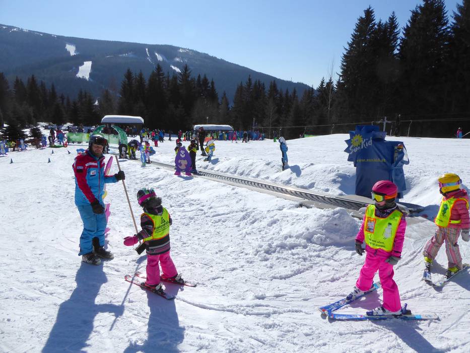 The largest children's area of the Skol Max ski school is located at the Svatý Petr valley station. Several conveyor belts, a children's carousel, a slalom course, and fun figures make children's hearts beat faster.