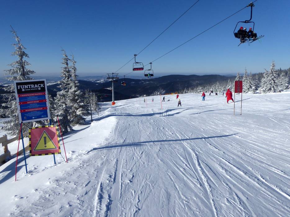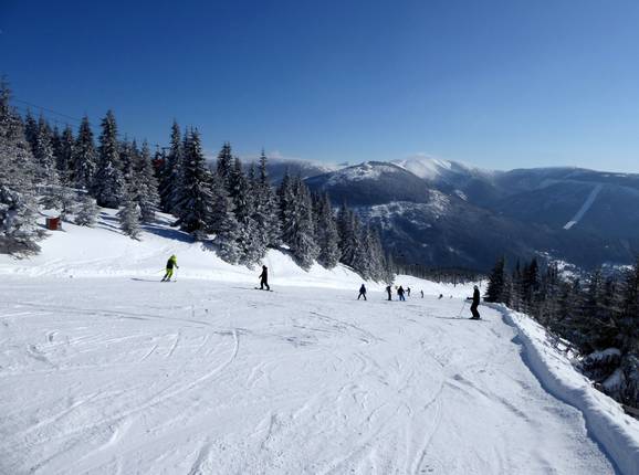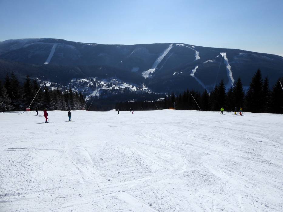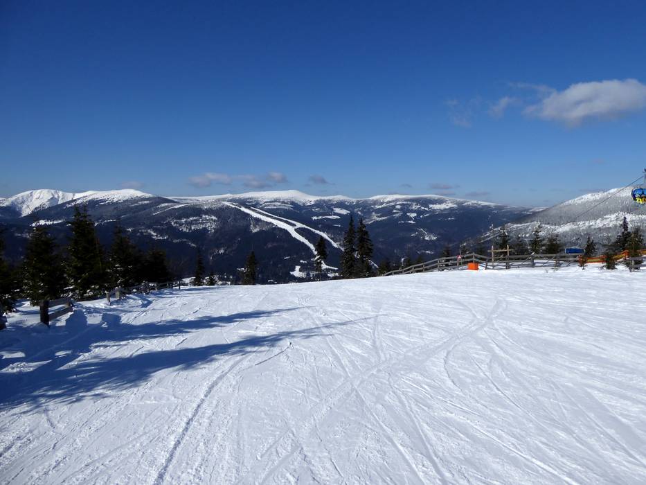 The Spindlermühle ski resort offers slopes of all difficulty levels. The runs mostly lead through forest clearings down to the valley. In general, the slopes are quite long and attractive for a low mountain range. The range of slopes is spread across the different resort areas: Horní Mísečky/Medvědín, Svatý Petr/Hromovka, Bedřichov, Labská, and Stoh. Overall, the runs are very wide and offer beautiful views of the Giant Mountains. Not all slopes are fully connected, so you need to use the ski bus to switch from one side to the other. In the future, a complete connection of the slopes with lifts and new runs is planned.