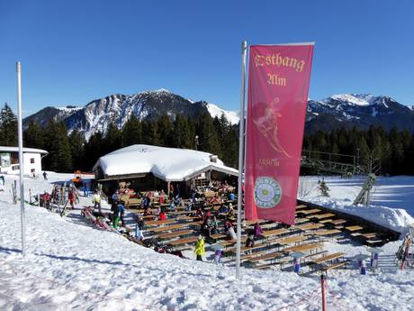 The Osthang Alm is a very beautiful self-service hut offering Bavarian delicacies. In the cozy and rustic parlors, you can enjoy excellent meals. The menu ranges from soups and stews to Tiroler Gröstl, schnitzel, Kasspatzen, and even mountain burgers. In good weather, the large sun terrace with a view of the Osthang is especially inviting.