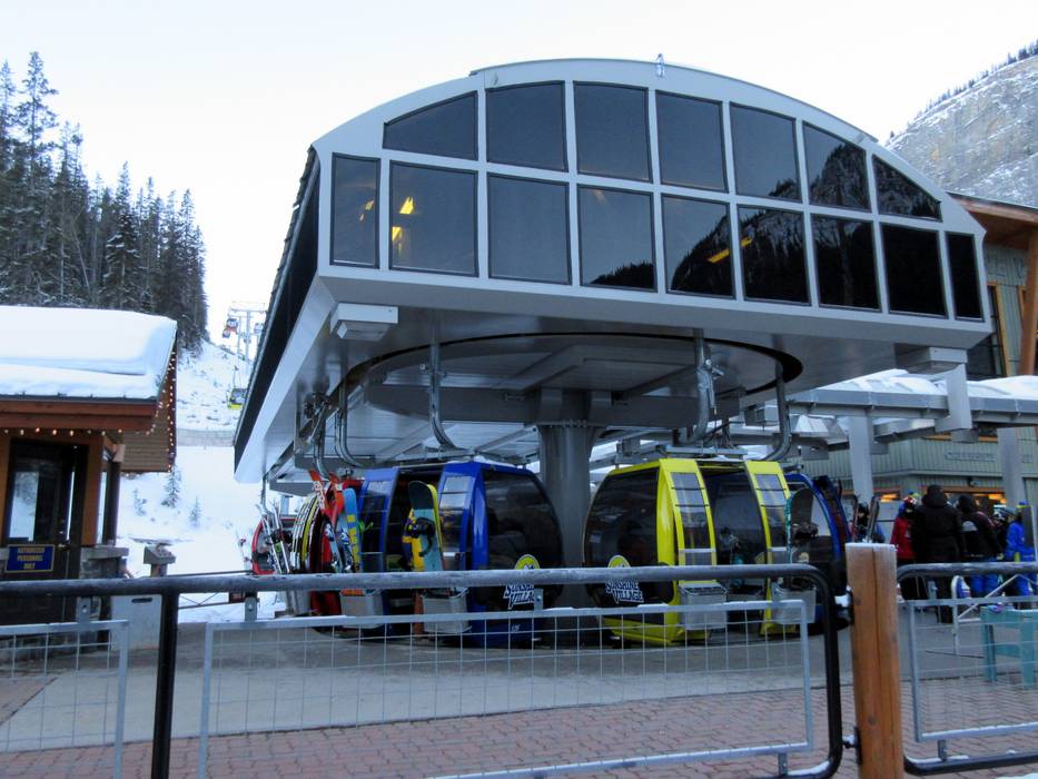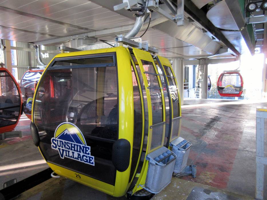The 8-seater Sunshine Village Gondola first makes a sharp left turn on its journey and then a slight right turn as it passes through the mid-station near the Goat's Eye Lodge.