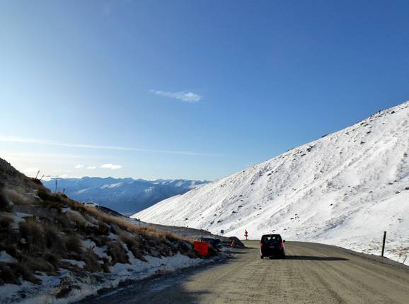 The Remarkables ski resort is located on the South Island of New Zealand. It is about 24 km/40 minutes from Queenstown. The road to the ski resort branches off at Kawarau Falls. The first 4 km of the steep mountain road are paved, and the remaining 9 km are on a gravel road leading to the parking lots below the base station. From there, you have to walk uphill a bit to reach the lifts. If the upper parking lots are full, you park about 2 km before the ski area. A shuttle bus then takes guests to the base station. It is strongly recommended to bring snow chains.