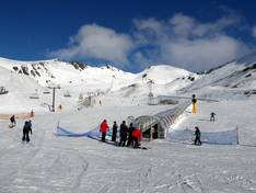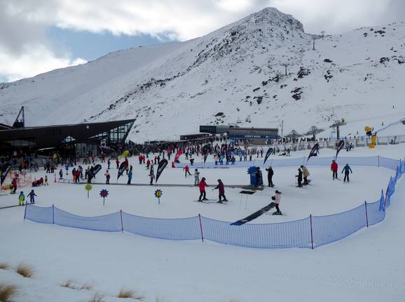 Right in front of The Remarkables Restaurant at the base, you'll find the Kids Zone with a conveyor belt. Here, families with children can learn to ski at their own pace. Fun obstacles complete the experience.