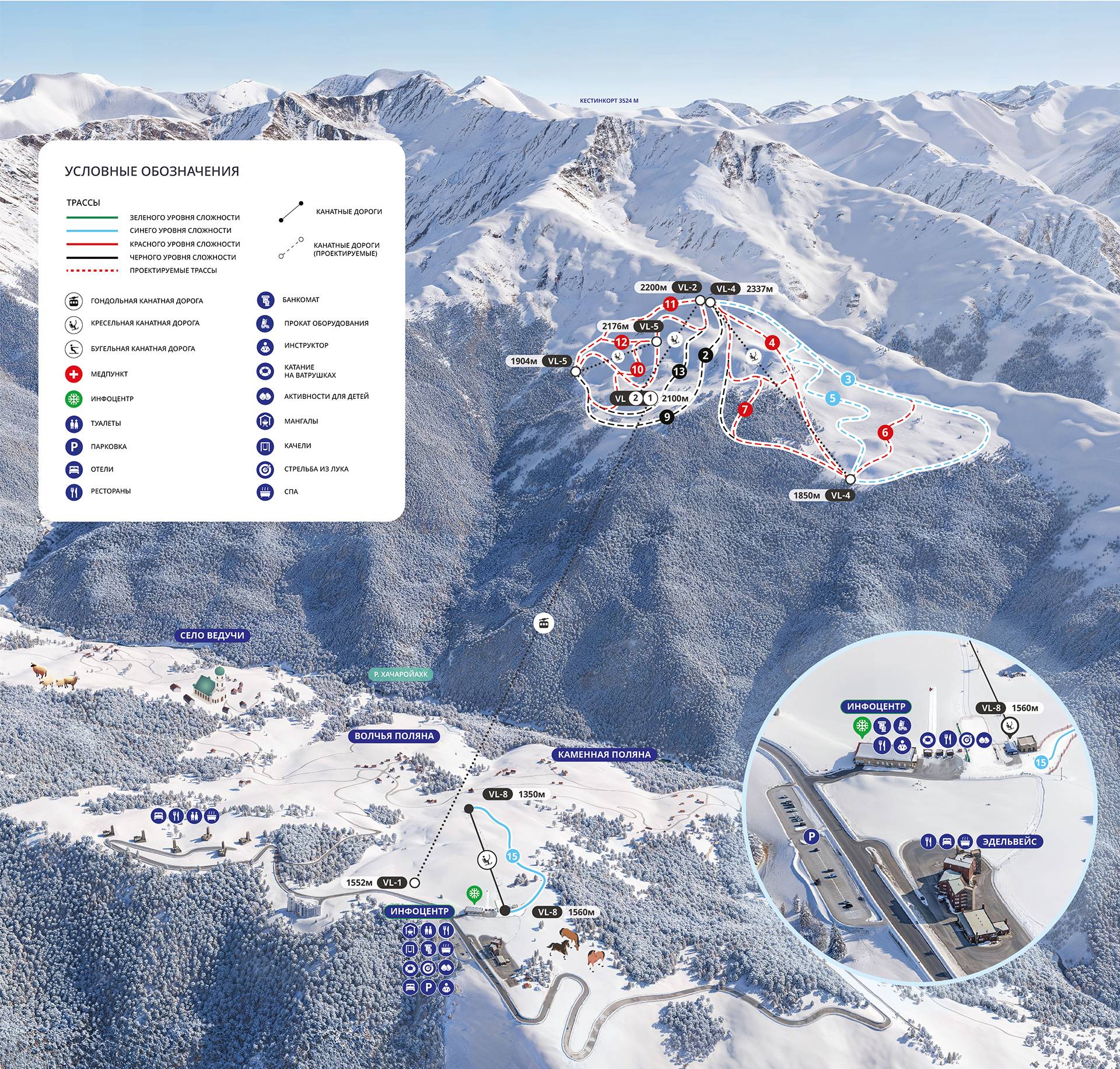 Veduchi (Ведучи) (0.6 km), Itum-Kale (Итум-Кале) (8 km) Towns/villages at the ski resort