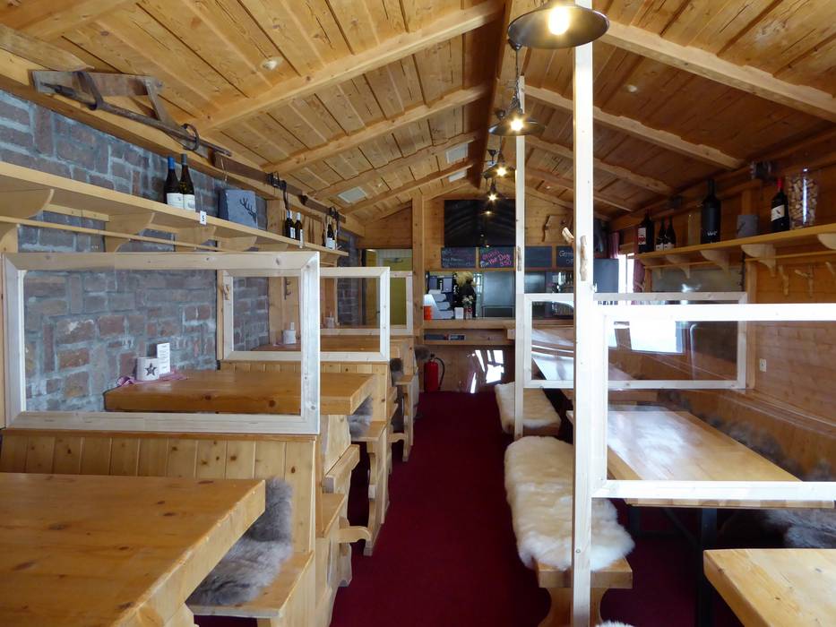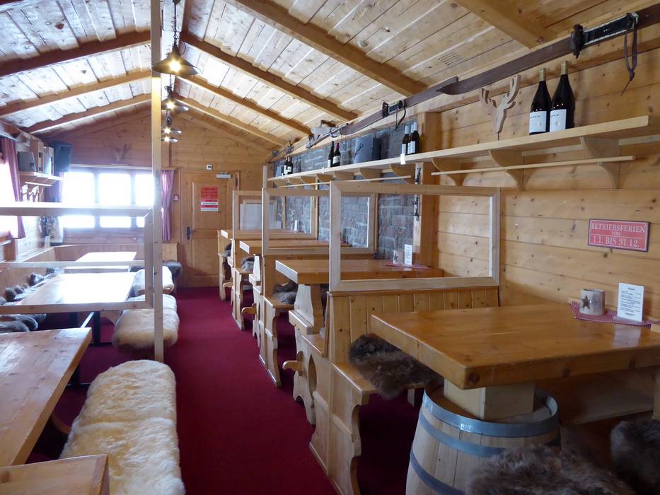 The cozy and rustic hut impresses with its magnificent panorama. On sunny days, deck chairs await you, and on cold days, a fireplace warms the rustic lounge. A selection of snacks is available.