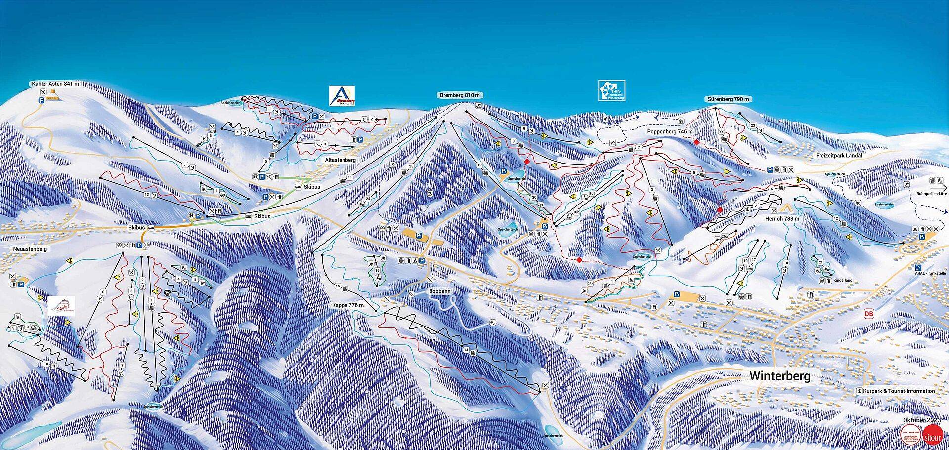 The rather complex topography of the ski area, with slopes in all directions, is depicted relatively clearly and comprehensibly on the piste map. However, the Kappe is shown a bit too small, and it appears as if the Sahnehang at Kahlen Asten is part of the Skiliftkarussell, which is not the case.