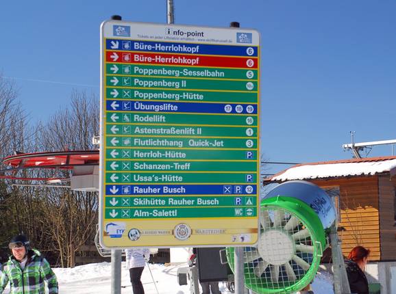 The Winterberg Skiliftkarussell is probably one of the very few low mountain ski areas where it can happen that skiers can't find the parking lot where they left their car in the evening. However, the signage in the ski area was completely renewed a few years ago and is now in good condition. At the mountain stations, there are boards with signposts to lifts, huts, and parking lots. Panorama boards, however, can only be found at a few points in the ski area. These, however, feature a dynamic display of the lift status.