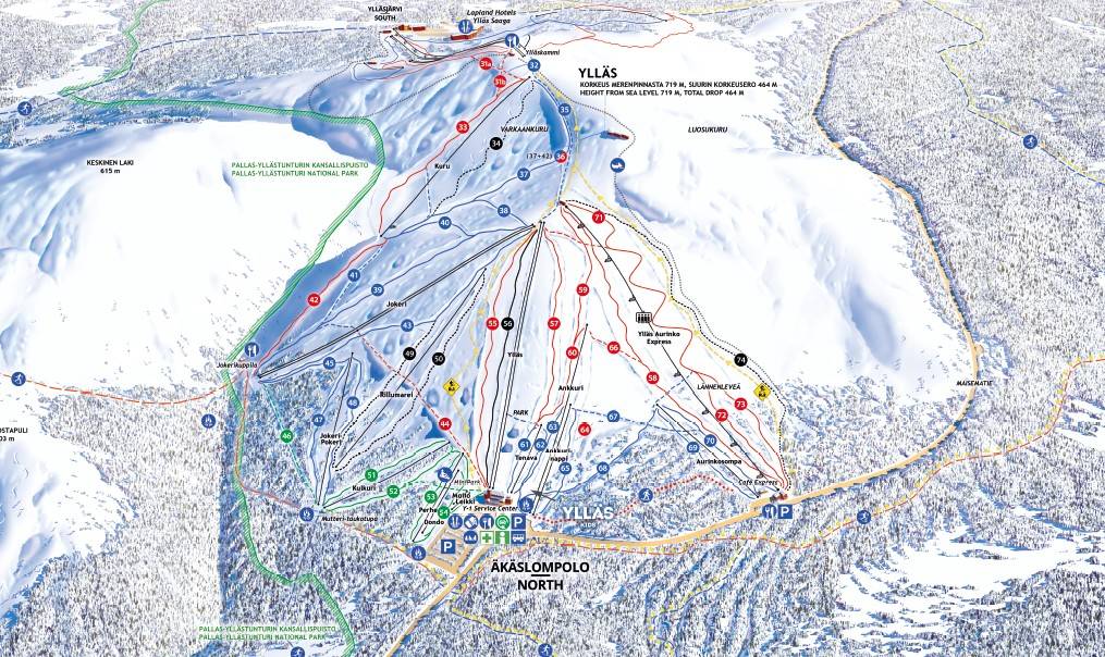 The piste map provides a good overview of the Ylläs ski area. All lifts and pistes are marked. You can also find prices and ski bus schedules. However, some detailed information could be added.