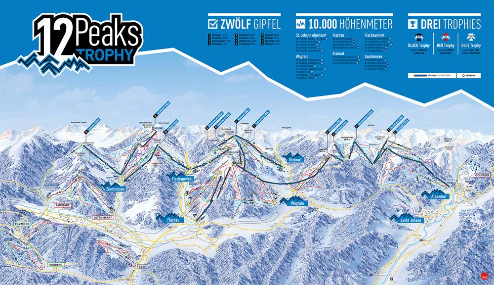 The most athletic way to make the most of the new ski connection from Zauchensee from Alpendorf! The challenge is to conquer twelve peaks in as few days as possible. In total, you'll cover 10,000 vertical meters and visit the most beautiful peaks in the region. Anyone who completes the challenge in one or more days will receive a trophy—according to the difficulty levels of ski slopes: Black (12 peaks - 1 day), Red (12 peaks - 2 days), Blue (12 peaks - 3 or more days). What are you waiting for?Skiing from A to Z