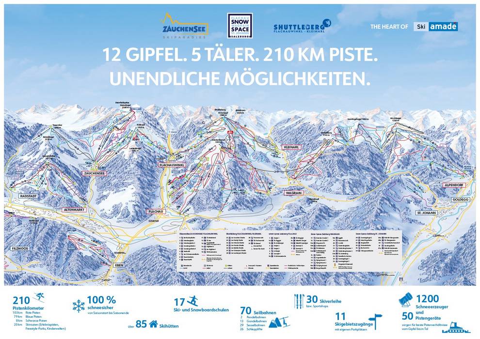 12 peaks, 5 valleys, endless possibilitiesThe new Panorama-Link cable car connects the ski areas of Zauchensee/Flachauwinkl/Kleinarl with Snow Space Salzburg. This creates one of the largest and most diverse winter sports regions in Europe, right in the heart of Ski amadé: with 210 kilometers of slopes, 70 cable cars, cool freestyle parks, and countless freeride hotspots. For the first time, ski circuits from Alpendorf to Zauchensee are possible (ski bus between Flachauwinkl & Shuttleberg)!