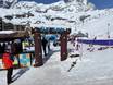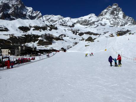 The children's area with a conveyor belt and playgrounds is located directly in the valley in Breuil-Cervinia at the Cretaz chairlift. The ski school "Scuola Sci del Cervino" offers not only ski courses for children but also a "Kid Zone." If the children are still too young to ski, they can play in the large children's playground in the snow.
