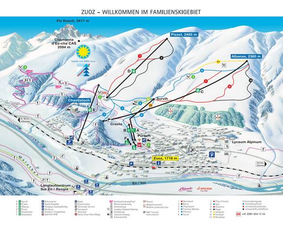 The Zuoz ski area, with its two mountain slopes Pizzet and Albanas, is very well represented on the piste map, which shows the slopes, lifts, dining options, and further information.