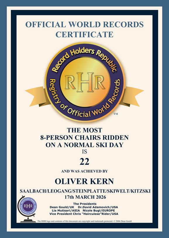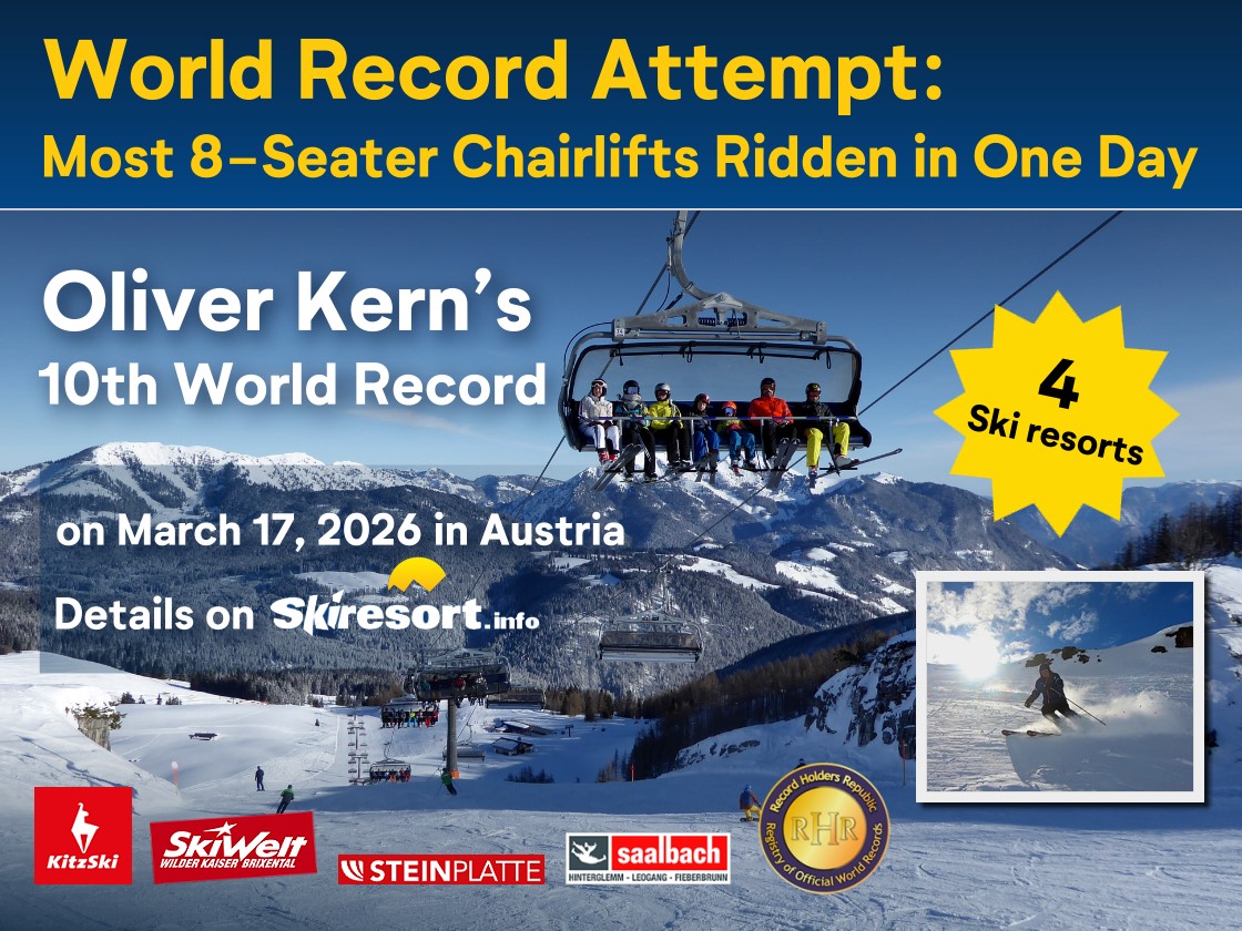 An extraordinary day of skiing with plenty of fresh snow and a new world record in the Austrian Alps: On March 17, 2026, Oliver Kern from the Skiresort website rode a total of 22 different 8-person chairlifts in a single day of skiing. The tour took him through several major ski resorts in the Salzburg region and Tyrol — including Skicicus Saalbach Hinterglemm Leogang Fieberbrunn, Steinplatte, SkiWelt Wilder Kaiser–Brixental, and the KitzSki ski resort.